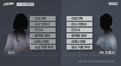 미국, 영국, 캐나다에서는 따로 면허를 따야 피가 될 수 있지만, 우리는 이름만 같을뿐, 법적 근거가 없습니다. 하지만과 흉부외과 같은 곳에서 합리의 간호사들이 이 일을 합니다. 의사들이 부족하기 때문입니다. 가 없으면 수술방이 돌아가지 않는다는 말도 나옵니다. 수술상처 거나 배관 제거하는 것들은 의사거든요. 같은 경우는 당연히 그냥 피하는 것처럼 돼서, 지금은 이제 아예 고쳐가고 됐어요. 엄밀이 따지면 불법입니다. 하지만 안 할 수가 없다고 합니다. 인사과 평가를 의사가 해요. 그래서 불법 무료를 해라라고 지시가 내려왔을 때, 그거를 못 하겠습니다라고 하는 피는 점수를 낮게 주고, 쉽게 거부할 수 있는 환경이 아니에요. 의사가 해도 위험한 일, 간호사가 해서 사고가 나면, 그건 그 누가 책임을 지느냐이 책임이 분명 벌어질 그런 일들이 너무 많아서, 전공들의 집단 사직으로 대규모 의료공백 사태가 터지자 정부는 [음악] 급하게, 료 진단서도 담당의사 최종승인을 전제로, PA 간호사가 초을 쓰고 동맥혈 취, 심폐소생술, 응급약물 투도, 응급 상황에서 허용하겠다고 했습니다.